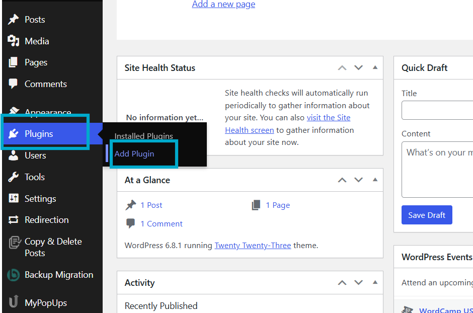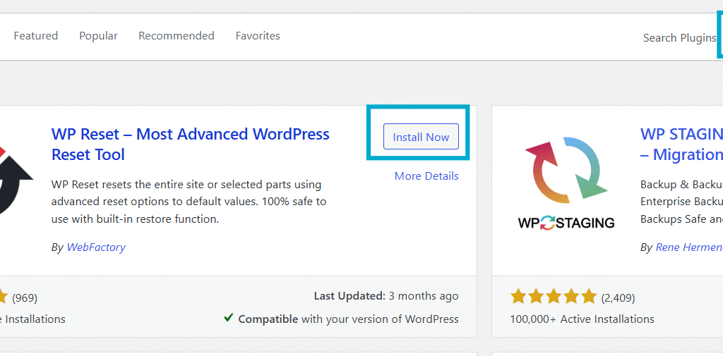 Navigate to Plugins > Add New. Search for WP Reset and click Install Now, then Activate.
