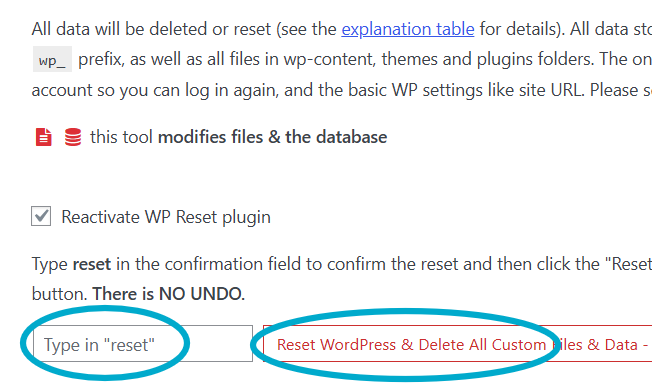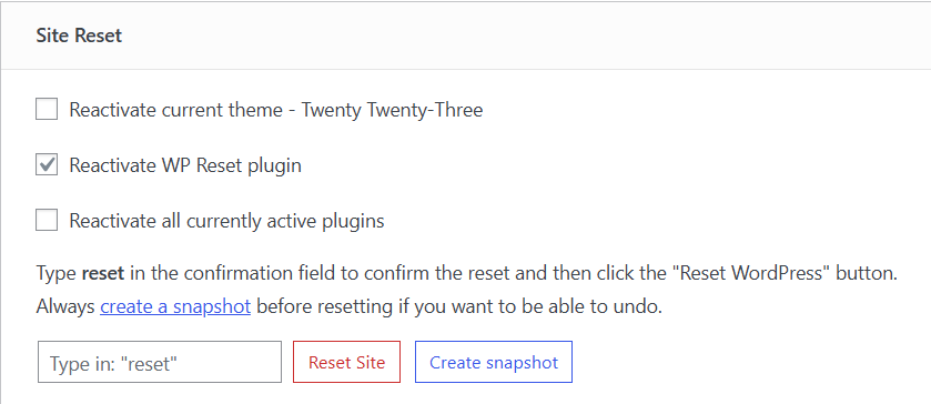 Note: WP Reset allows you to take snapshots before resetting making it easy to restore your site if needed.