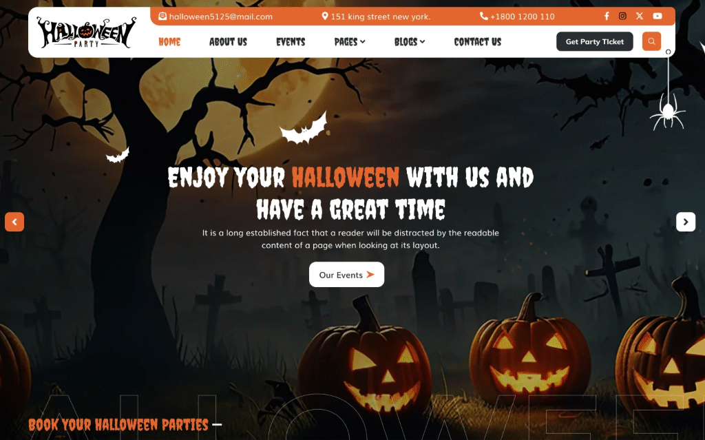 This theme belongs to the class of specialized Responsive WordPress Templates, crafted to work flawlessly on every device whether users are browsing from a desktop or trick-or-treating with their phones in hand. WooCommerce support allows you to sell party tickets, costumes, decorations, or digital Halloween downloads directly from your site. It’s also equipped with flexible customization options, animation effects, and social media integration to promote your haunted brand. Whether you’re building a site for a one-time event or a seasonal ecommerce shop, this theme delivers an immersive and festive user experience.